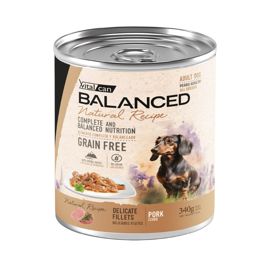 Alimento húmedo en lata marca Balanced Natural Recipe elaborado con cerdo para Perros Adultos