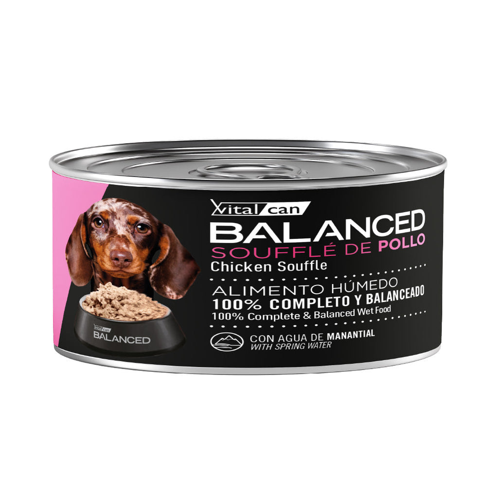 Alimento húmedo en lata marca Balanced elaborado con souffle de pollo para Perros Cachorros
